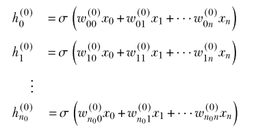 This pattern continues for all functions up to: h subscript n_0 superscript (0) equals sigma of the sum of terms where each term is a product of a weight, w, and a variable, x. Specifically, the terms are: