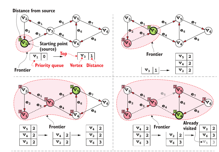 - While in BFS each vertex was added to the (plain) queue and never updated, Dijks- tra’s algorithm uses a priority queue to keep track of the closest discovered vertices, and it’s possible that the priority10 of a vertex changes after it has already been added to the queue. (View Highlight)