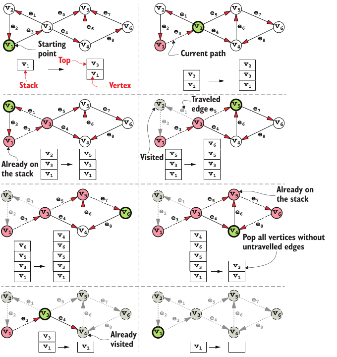- ” It’s like when you are in a maze looking for the exit: you keep going as far away from the source as possible, choosing your direction at each intersection, until you hit a dead end (in graph terms, until you get to a vertex without any untraveled outgoing edges). At that point, you retrace your steps up to the previous bifurcation (the previous vertex with at least an untraveled edge), and choose a different path. This is the idea behind Depth First Search (DFS), (View Highlight)