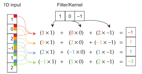 Note: 1D convolution. In 2D, the kernel is a matrix. In 3D, it is a rank-3 tensor; etc.