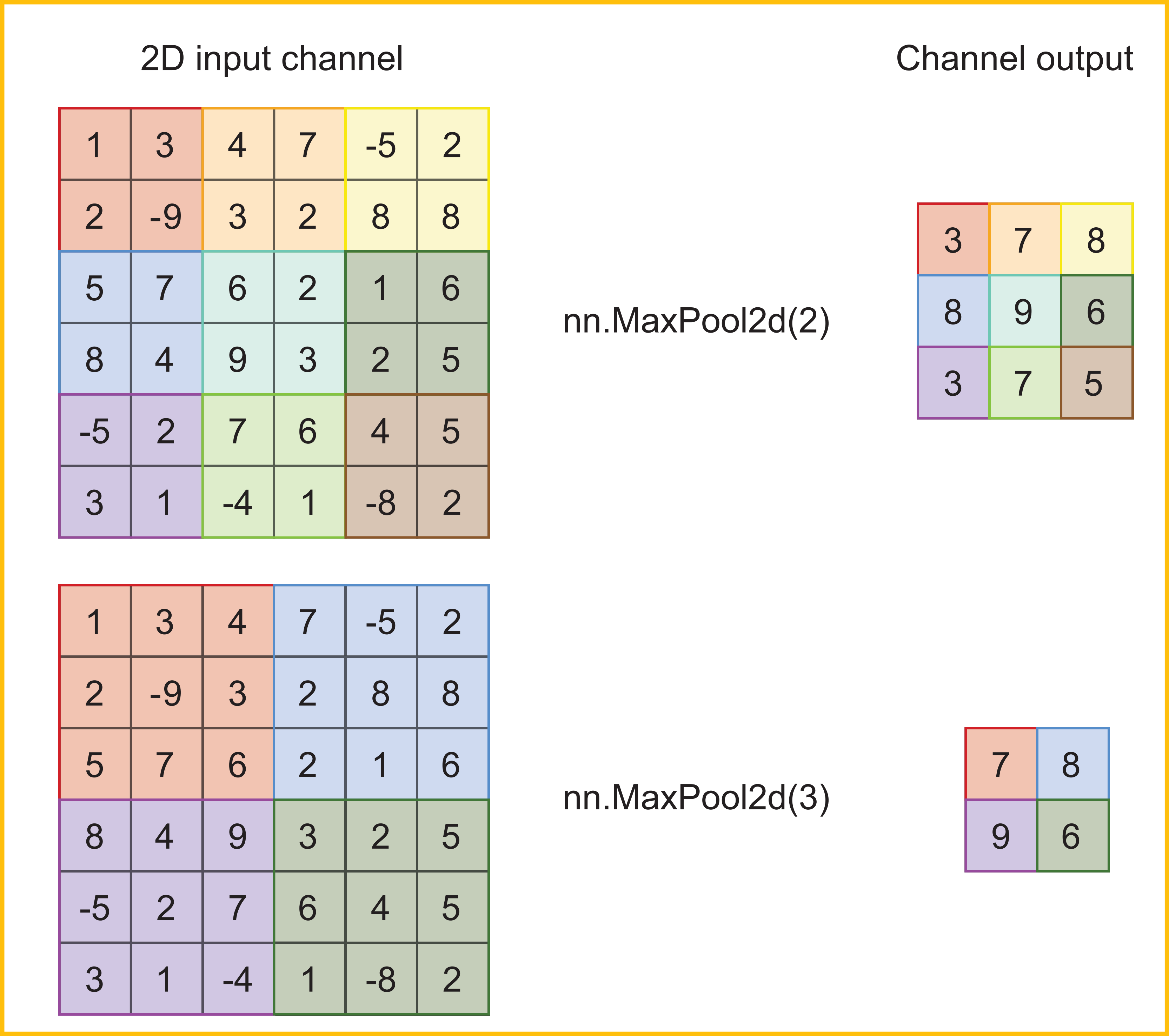 Having a stride of K means we shrink the size of each shape dimension by a factor ofK. So if our input has a shape of (B, C,W,H), the output of nn.MaxPool2d(K) will be a shape of (B, C,W/K,H/K). (View Highlight)
