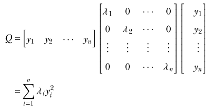 - The quantity n i=1 휆i y2 i , where n i=1 y2 i =1 and 휆1 ≥ 휆2 ≥ · · · 휆n, attains its maximum value when y1 =1, y2 = · · · yn = 0. (View Highlight)