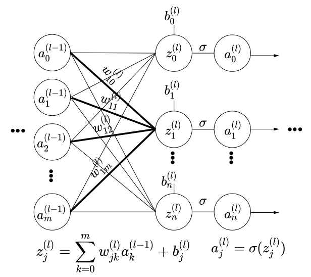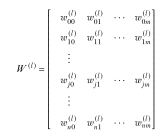 The weight of the connection from the kth neuron in layer (l −1) to the jth neuron in layer l is denoted w(l ) jk . (View Highlight)