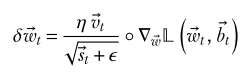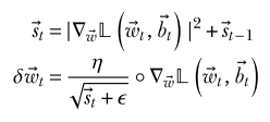Note: AdaGrad maintains a state vector consisting of the sum over all iterations of the squared partial derivatives of each parameter in the model. That is, if is the state vector at time , then the value for parameter is