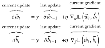 At , this looks like ordinary SGD: we are taking the gradient, with respect to the weights, of the loss evaluated given the current parameter values and \mathbf{b}$. The momentum term is zero, and the offset is zero.