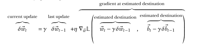 Note: Nesterov’s accelerated gradient (NAG) computes the gradient with respect to the CURRENT weights of a point in parameter space described by the CURRENT weights offset by the the CURRENT momentum (which is a fraction of the weight changes in the PREVIOUS iteration). This is scaled by the learning rate and added to an ordinary momentum term.